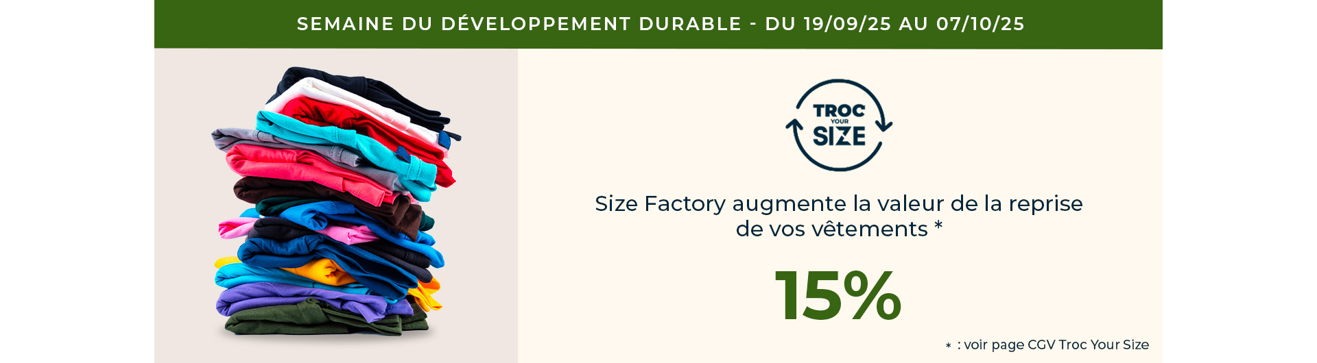 Dans le cadre de l'Offre "Troc Your Size" ("l'Offre"), Enyom Distribution s'engage à reprendre des articles précédemment achetés par un client dans un magasin physique "Size-Factory" ou sur le site internet www.size-factory.com et générer en contre partie un bon d'achat, d’un montant équivalent à 15% du prix d'achat TTC des articles repris, à valoir sur un nouvel achat du client à effectuer durant la durée de l'opération (19/09 au 07/10 2025) sur les produits disponibles en stock dans le magasin dans lequel les articles ont été repris.