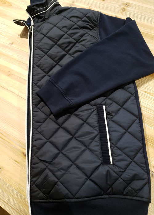 Si cet aspect “teddy estudiantin” est un point fort de cette veste, c’est aussi dû à la dualité des matières. Cette dualité permet de twister les sempiternels codes, que l’on aurait pu juger trop classiques. Ici, les manches sont développées dans un polyester lisse et élastiqué, alors que le reste de la veste se pare d’un joli motif matelassé. Une manière de dire que le style appartient à tout le monde, et que tout est possible !