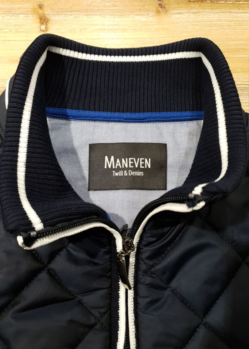 Cette veste de mi-saison est pensée par Maneven avec la couleur bleue. Mais ce même bleu est décliné en tonalités plus ou moins sombres, ponctuées par des touches de blancs. Cette dualité colorimétrique laisse donc apparaître un esprit à la lisière de la veste d’étudiant américain. Et ça, on adore !
