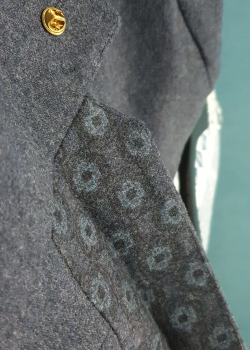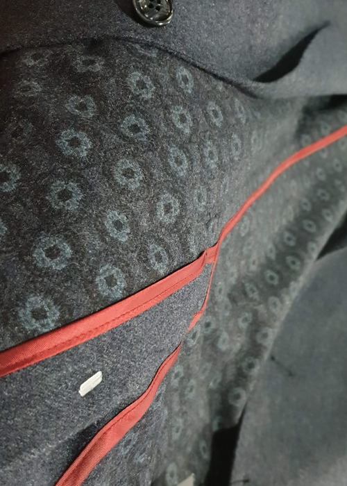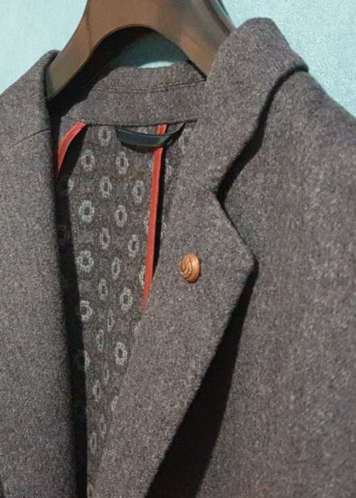 La couleur n’est pas le seul élément qui vient habiller l’intérieur de la veste flanelle en laine Trandy. Un motif géométrique est directement imprimé sur le tissu, motif que l’on retrouve par ailleurs sous le col. Sur le revers gauche, vous aurez le plaisir de trouver un pins marron gravé de motifs végétaux. Une touche discrète, mais du plus bel effet ! Enfin, au bas de la manche se trouvent 4 boutons superposés cousus. Le premier se voit orné d’un fil rouge, dernier clin d’œil étonnant de finesse.