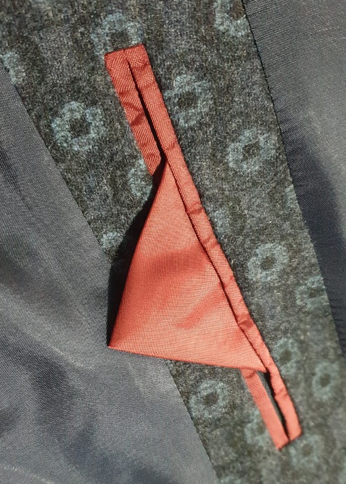 La couleur grise et bleutée de cette veste en laine la rend facile à porter en automne et en hiver. Mais ce sont les multiples détails de ce vêtement qui lui permettent de se démarquer réellement, à commencer par les boutons noirs, légèrement nacrés. Ceux-ci sont cousus à l’aide d’un fil rouge, véritable leitmotiv visuel. En effet, en ouvrant la veste Trandy, le rouge bordeaux luxueux saute immédiatement aux yeux et séduit par son audace. Le vêtement, simple d’apparence et discret, se voit magnifié par ces filaments carmins, que l’on retrouve sur les doublures latérales, mais également autour des poches intérieures. Celles-ci sont au nombre de trois, une sur le côté droit et les deux autres sur le côté gauche.