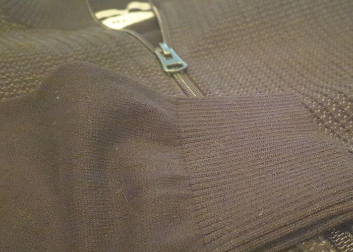 L’heure est au minimalisme et à la simplicité. MN03 prend le pari de livrer un vêtement sobre et sans fioriture, mais bien fini. À première vue, le noir omniprésent semblent rendre ce gilet sévère et un brin austère. Mais en réalité, le vêtement arbore différentes textures qui lui confèrent toute son élégance. Une sorte de maille garnit les panneaux avant, et rappelle la confection d’un pull-over épais. L’arrière et les manches se veulent plus fines, ce qui évite une nouvelle fois de trop étouffer avec ce gilet sur le dos.